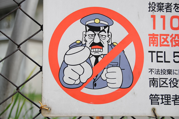 迫力あるイラスト看板。警察官のはずですが、恐いです。